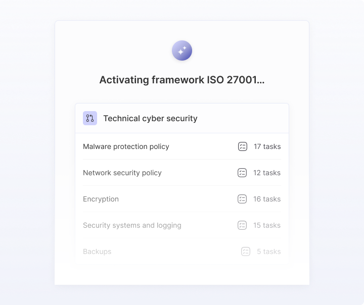 Cyberday AI gives you the quickest, affordable and credible way to build your ISMS and get compliant with any relevant security framework for you. Start free in minutes.
