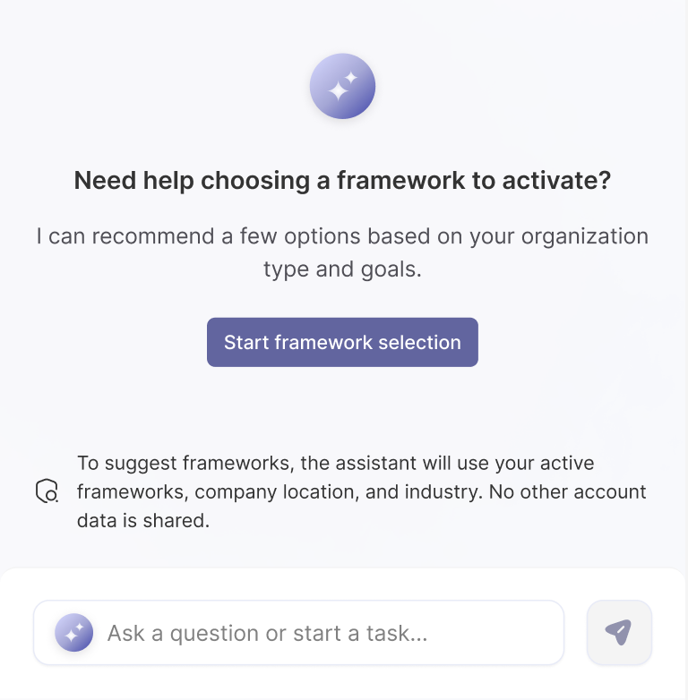 When an action in the assistant (e.g. framework selection, compliance report analysis or process description writing) will use some of your organizational details or data you provide in an AI analysis, this will always be clearly communicated for you.