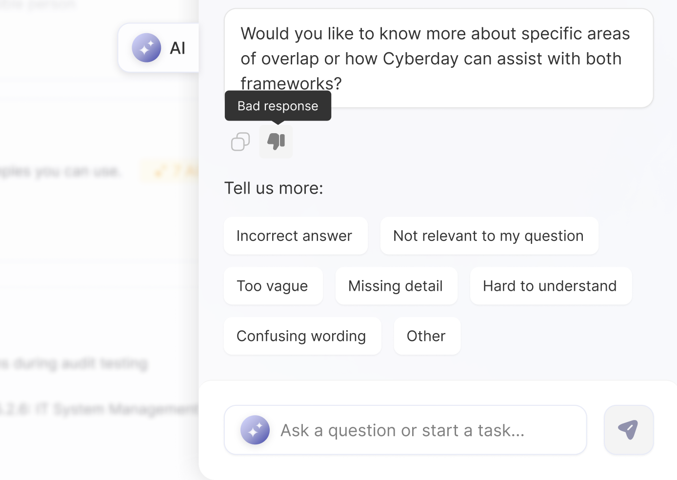 Save hours of manual work. Cyberday AI Assistant will help you write policy content, explain frameworks, suggest best practices, and create reports - all in seconds.