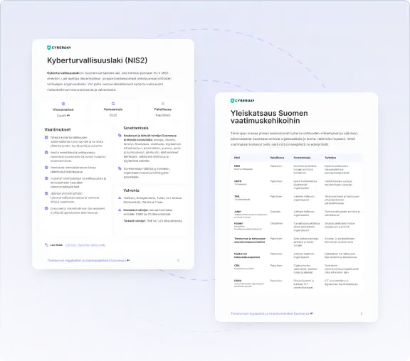 Saat selkeän kuvan Suomen vaatimuskentästä. Yksiin kansiin on kerättynä kaikki merkittävät kyber- ja tietoturvan lainsäädännöt ja vaatimuskehikot, jotka vaikuttavat eri aloilla Suomessa. Opas esittelee jokaisen vaatimukset, ja keitä ne koskevat.