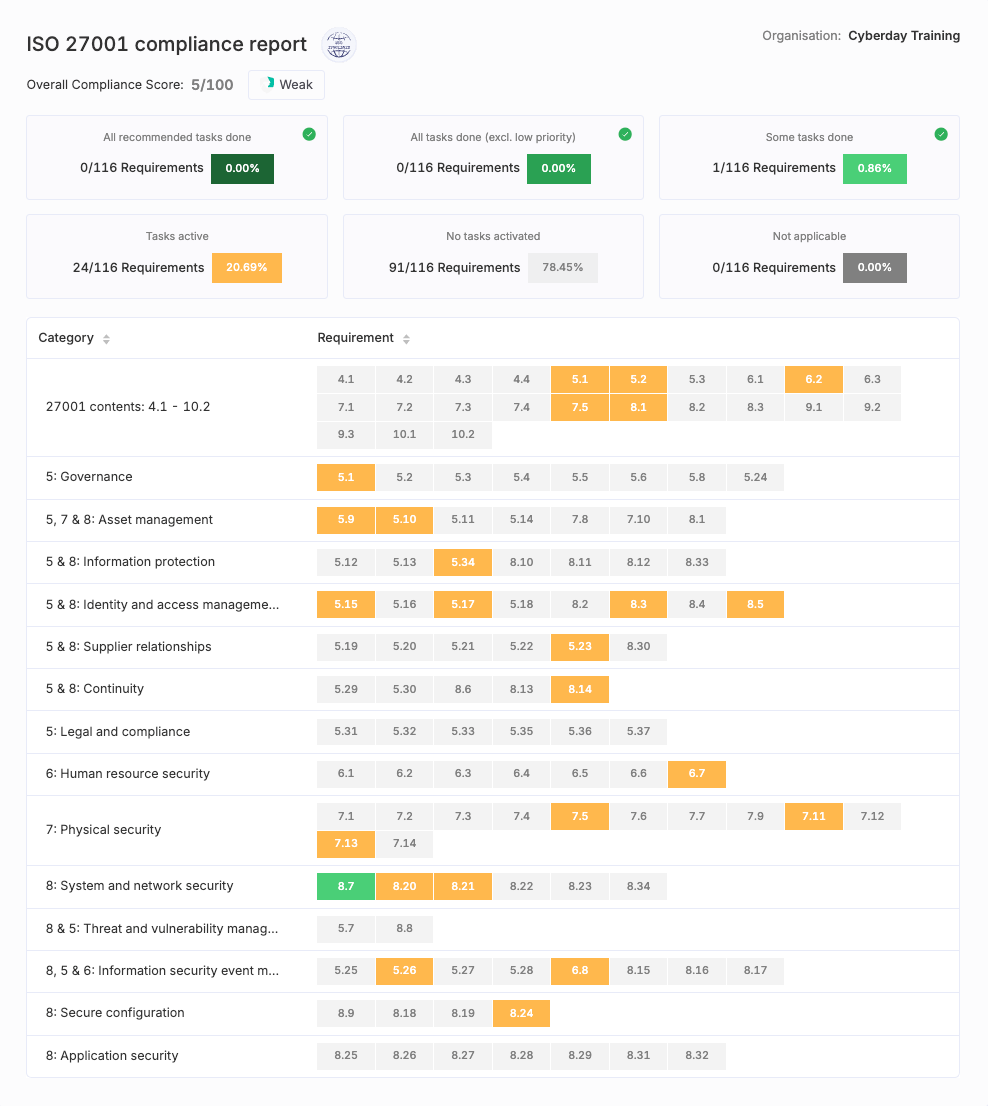 A separate compliance report is automatically available for all of the frameworks supported in Cyberday.