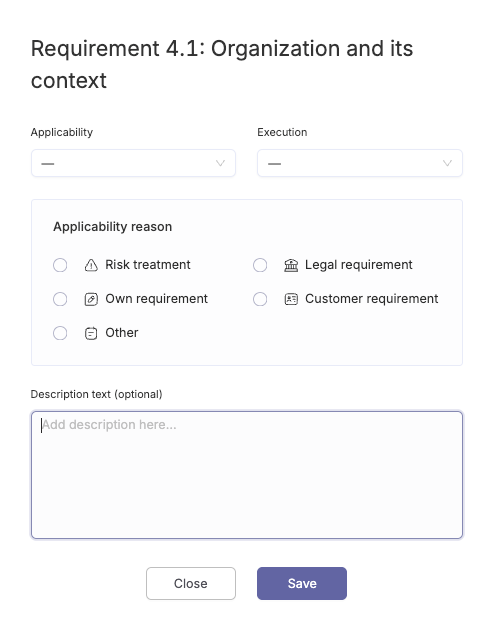 - Find a summary of the section treatment status and edit the requirement. The values for the requirements are filled automatically by default, but you can change the applicability and execution status manually here. E.g. state in there if that specific requirement is not applicable to your organization and why.Use Edit statuses manually to change how the requirement is treated. For example, if a specific requirement is not applicable to your organization, you can mark it as Not applicable and add a justification explaining why.The section then will be greyed out in the overview table in the start of the compliance report.