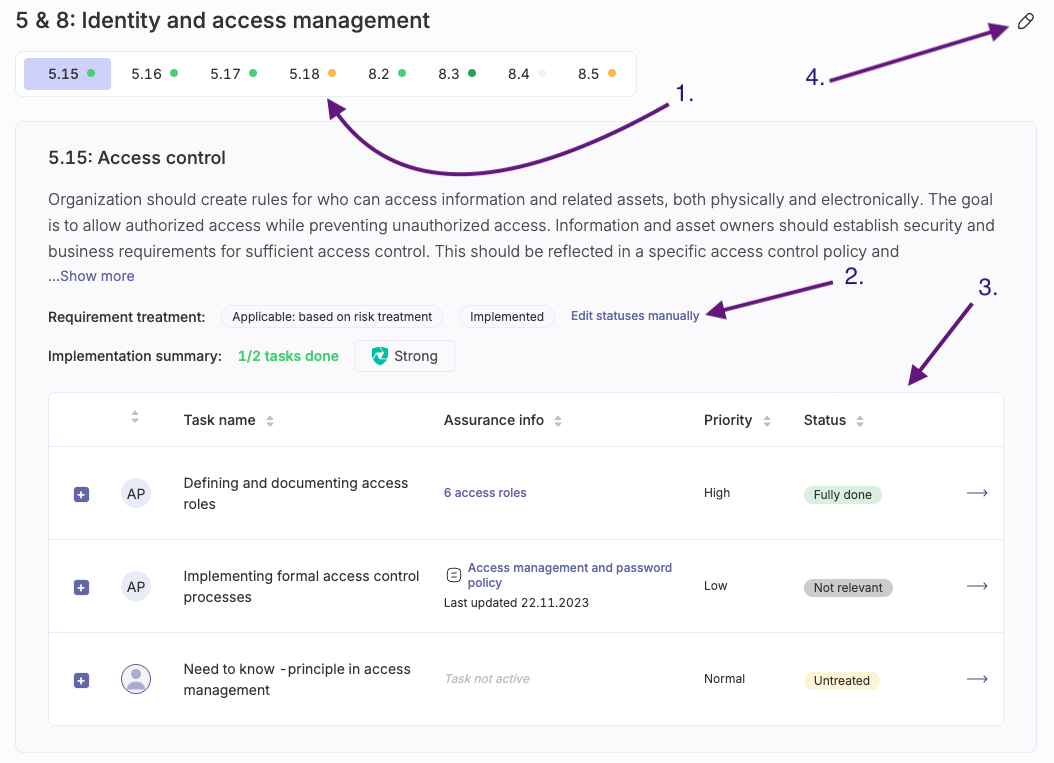 The compliance report details for each requirement refer to the task table shown under a requirement on the reports main section. You can get there by clicking on any of the requirement numbers in the overview, e.g. click on the "5.15" from the ISO 27001 compliance report. You will jump directly to the following kind of view (purple numbers explained below)):