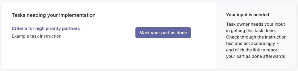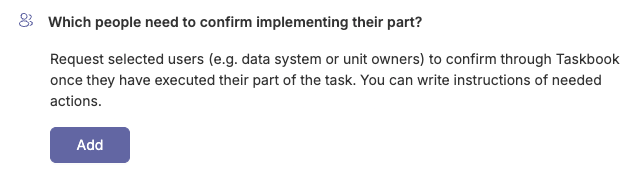 - Which people need to confirm implementing their part? - Request selected users (e.g. data system or unit owners) to confirm through Taskbook once they have executed their part of the task. You can write instructions of needed actions.