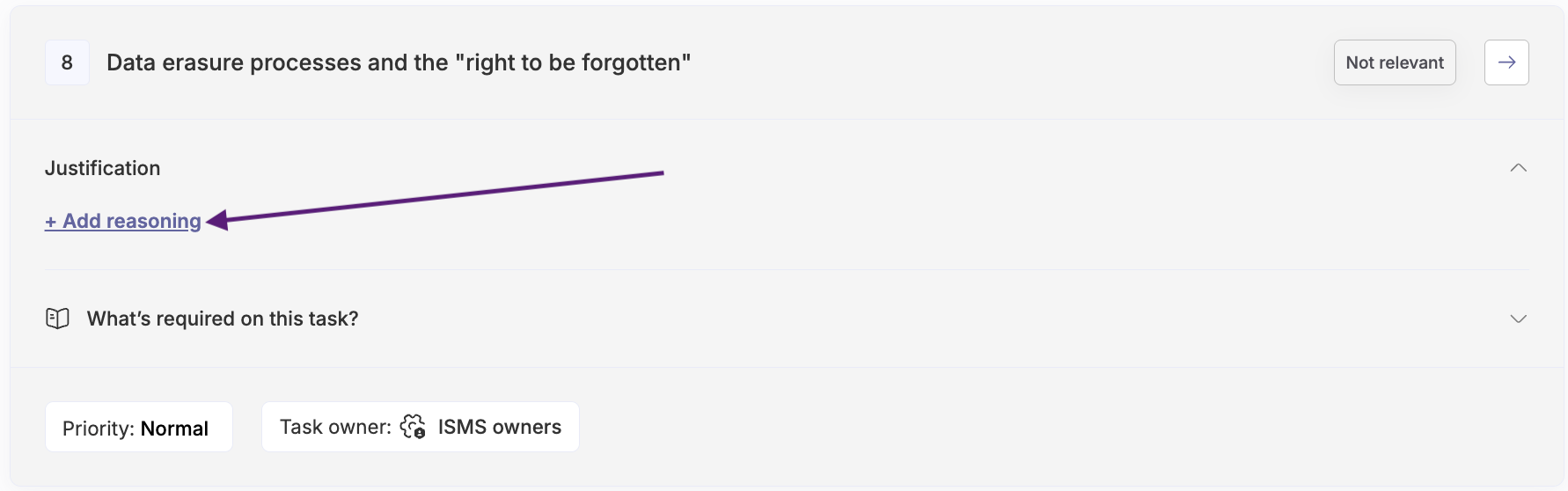 After that, it is important that you add a description to the non-relevant task to explain that. When you mark the task as not relevant, it will still be listed in your policy. Click the editing button to get to the task card and describe why this task is not relevant to your organization.