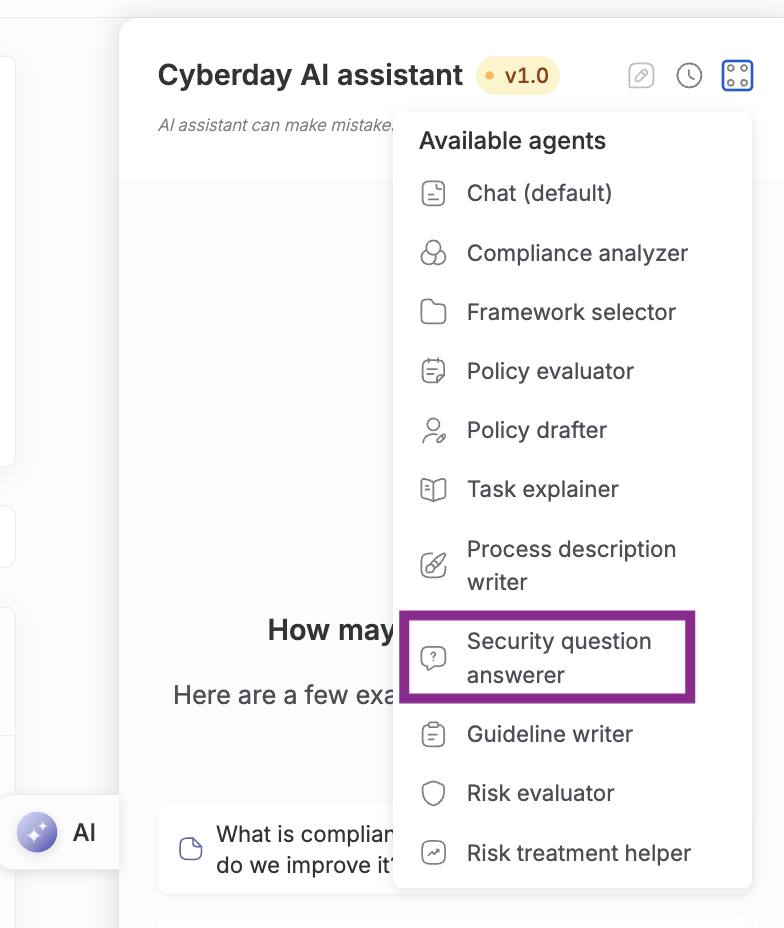 This agent is equipped to help you answer certain security questions about your organisation through the content that you have configured in Cyberday. These questions can for example be questions from vendor security questionnaires or common auditing questions, so that you can be prepared for questions about your ISMS or find some gaps that you may have missed in configuring your ISMS.
