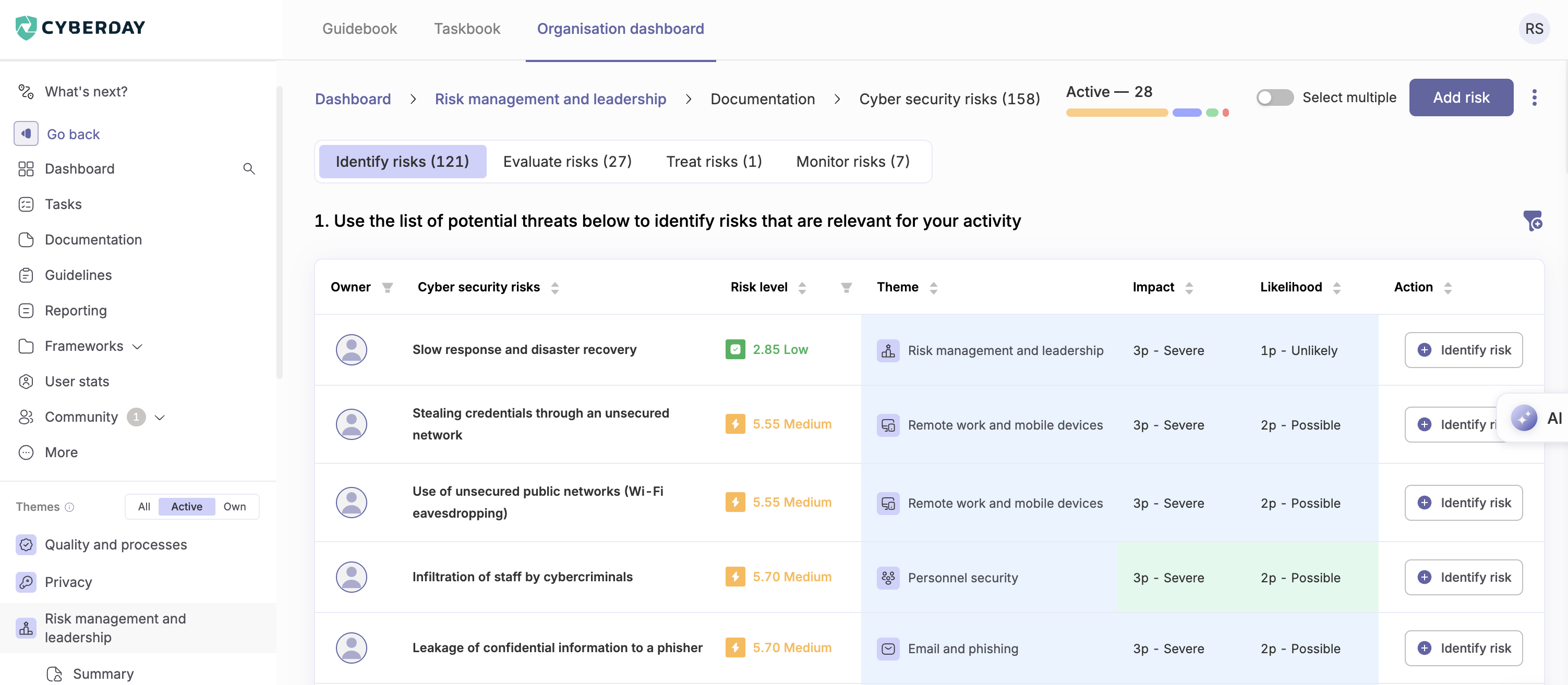 Cyberday innehåller bakgrundsinformation om relevanta risker för varje uppgift. När en uppgift aktiveras i Cyberday läggs de tillhörande riskerna automatiskt till i riskregistret.